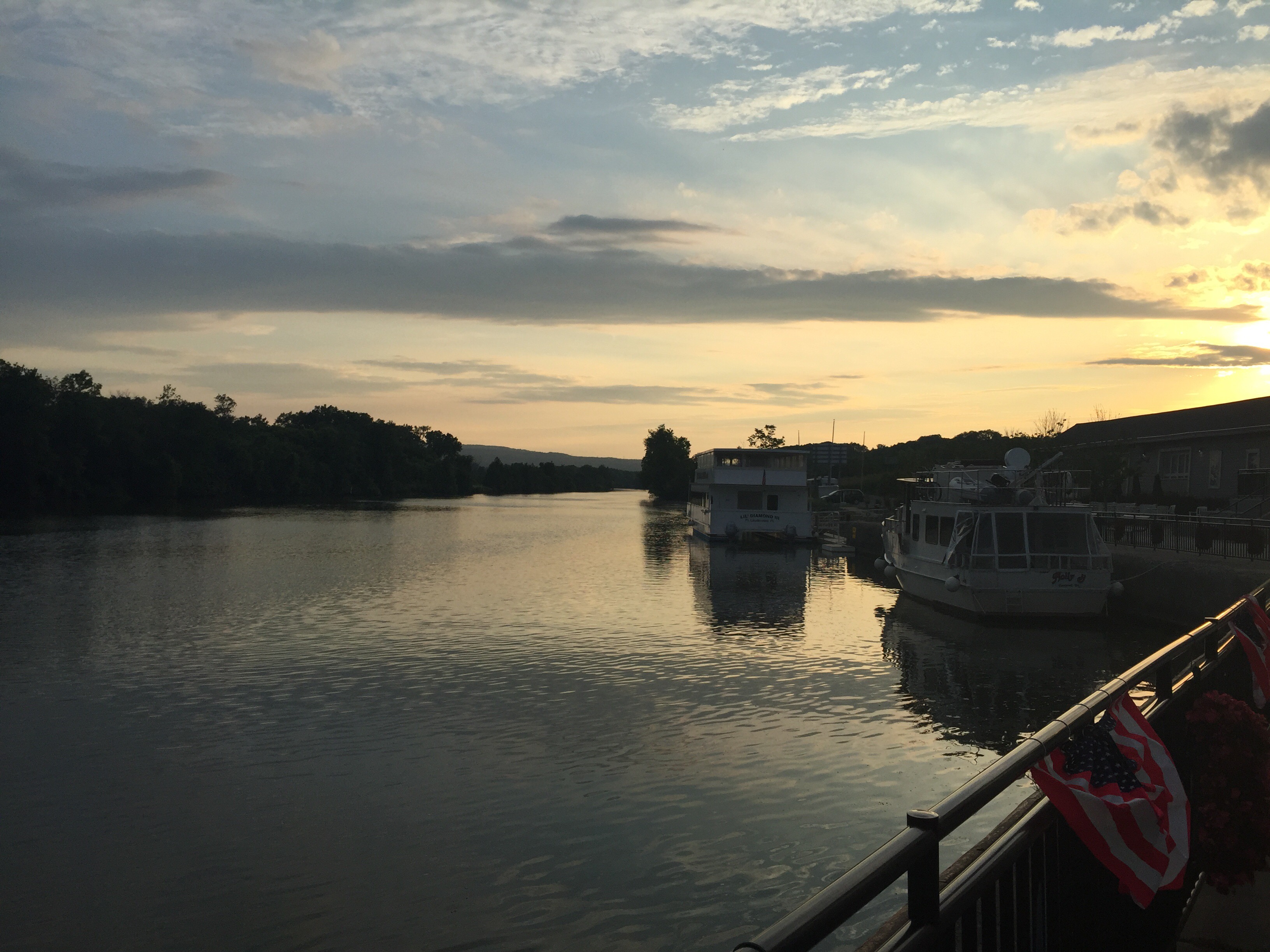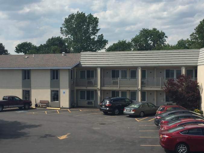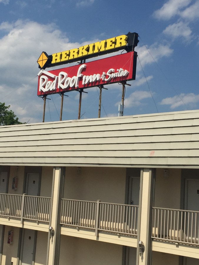 I’ve been asking around as usual as to what puts Herkimer NY on the map, historically, geographically, and of any other interesting facts. What I’m concluding is pretty much kind of not much. There is a Fort Klock, so then I wonder why not Klockimer ? Humm. ? I know, because I see it from my hotel window there is a Herkimer exist on the NY Thurway. And there is a canal which seems to be the hub of activity. We ate at the Waterfront Grill twice today, lunch after our ride and back for dinner in lieu of another Appllebee’s !!! See photos A group of us elected to pay for dinner there vs. a free Applebee’s. Our nights lodging is at the Red Roof Inn where apparently the roofing contract has the roof color in very fine print. See photos. All interesting things you notice in Herk Town.