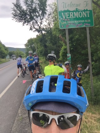 But the weather wasn’t going to cooperate and make today easy. We crossed the state line and sprinkled our Pacific Beach sand as our good luck at the state sign. This is a tradition as you cross state borders and wish good luck. We carry beach sand from our departure at Manhattan Beach Ca along with us. Just after crossing the border we climbed up into Bennington Vt a very nice quiet town. We stopped and visited the grave site of Robert Frost behind an old church. The dates of on some gravestones go back into the late 1700’s. The town dripped in history and I would have liked to spend more time there. But it started to lightly drizzle. As we left town it turned to rain. And as we started a long 6 mile climb over a mountain it came down hard and mixed with hail. Yep, wrong sunglasses McCauley! So as we reached the top the temps dropped to 40 but I thankful that my light rain jacket kept me fairly dry and pretty warm.