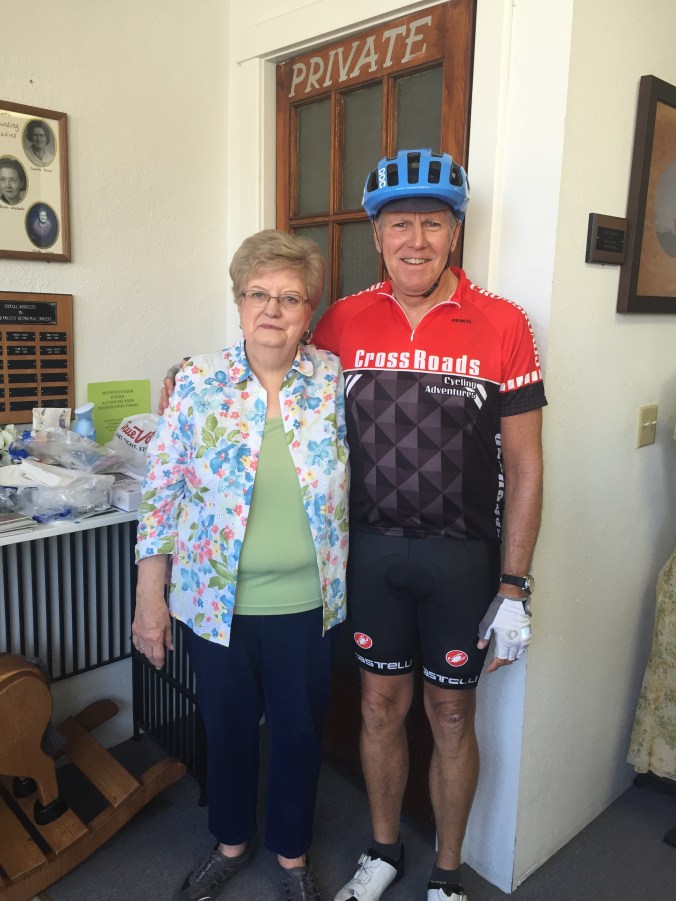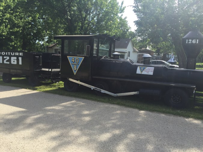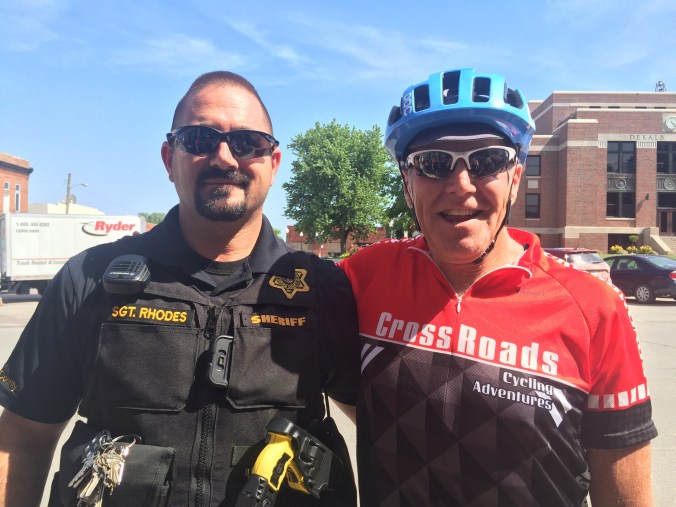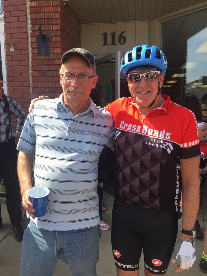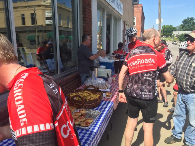 Today we were greated by the locals at a very small town of 1200 called Mayville. Every year they gather to great, cheer and meet the Crossroads riders. They make quite the big deal about it. In fact apparently they plan it all year long, it’s even discussed at town council meetings. They love the owner Tracey of Crossroads as she’s come thru for 22 years with her riders. One guy, Buck gets up at 4 am and bakes his scrumptious cinnamon rolls. We were treated like celebrities. The mayor was there, the newspaper and they open up the historical society museum for us to tour Etc. It was classic, everyone was so amazing and genuine. One cattle rancher I talked to was a former Mo. state senetor. After being told by the mayor that Mayville has 1200 residents, another woman corrected him. It seems it’s now actually 1182. She says the town is getting smaller with folks kicking the bucket ! See photos