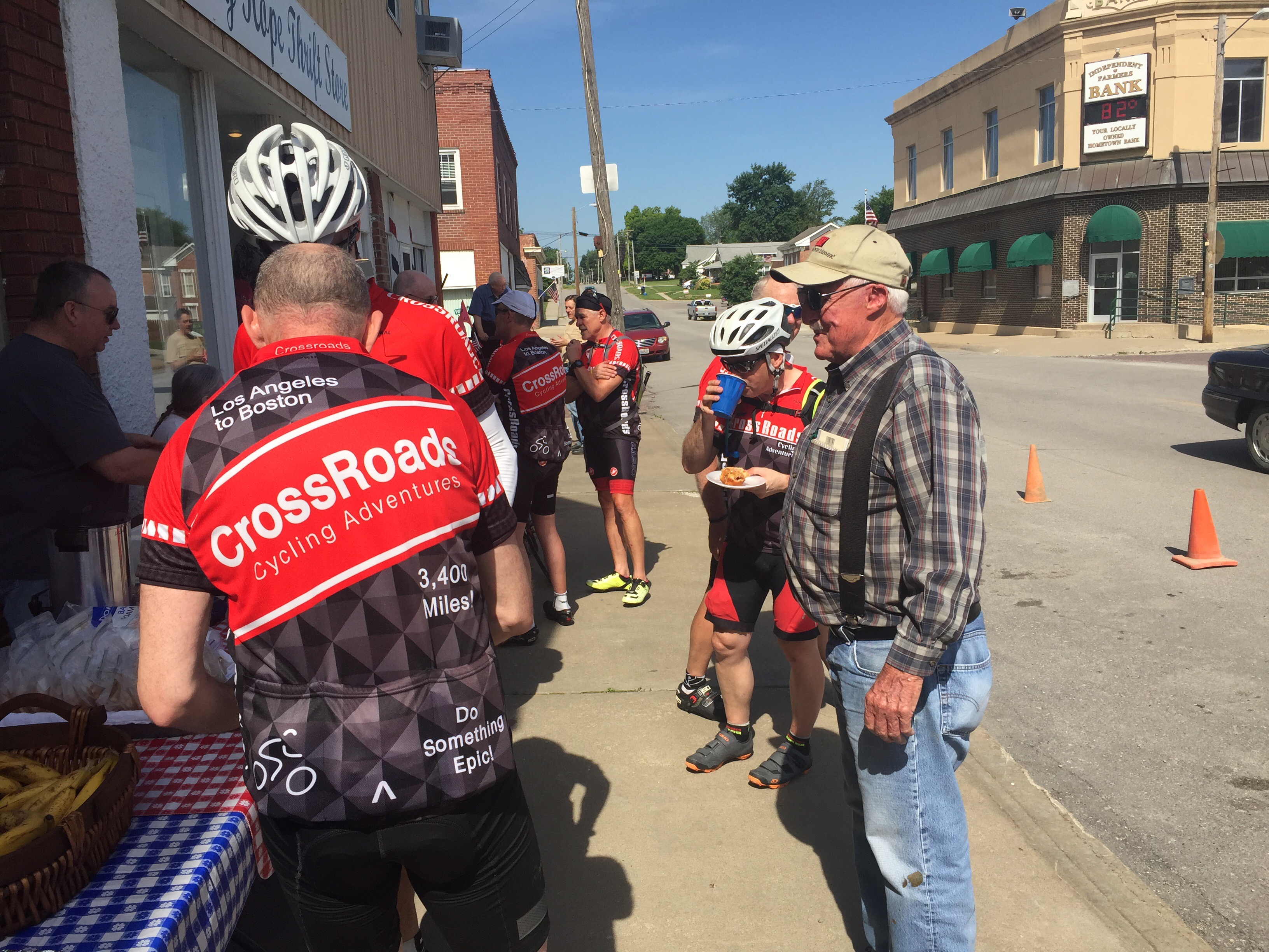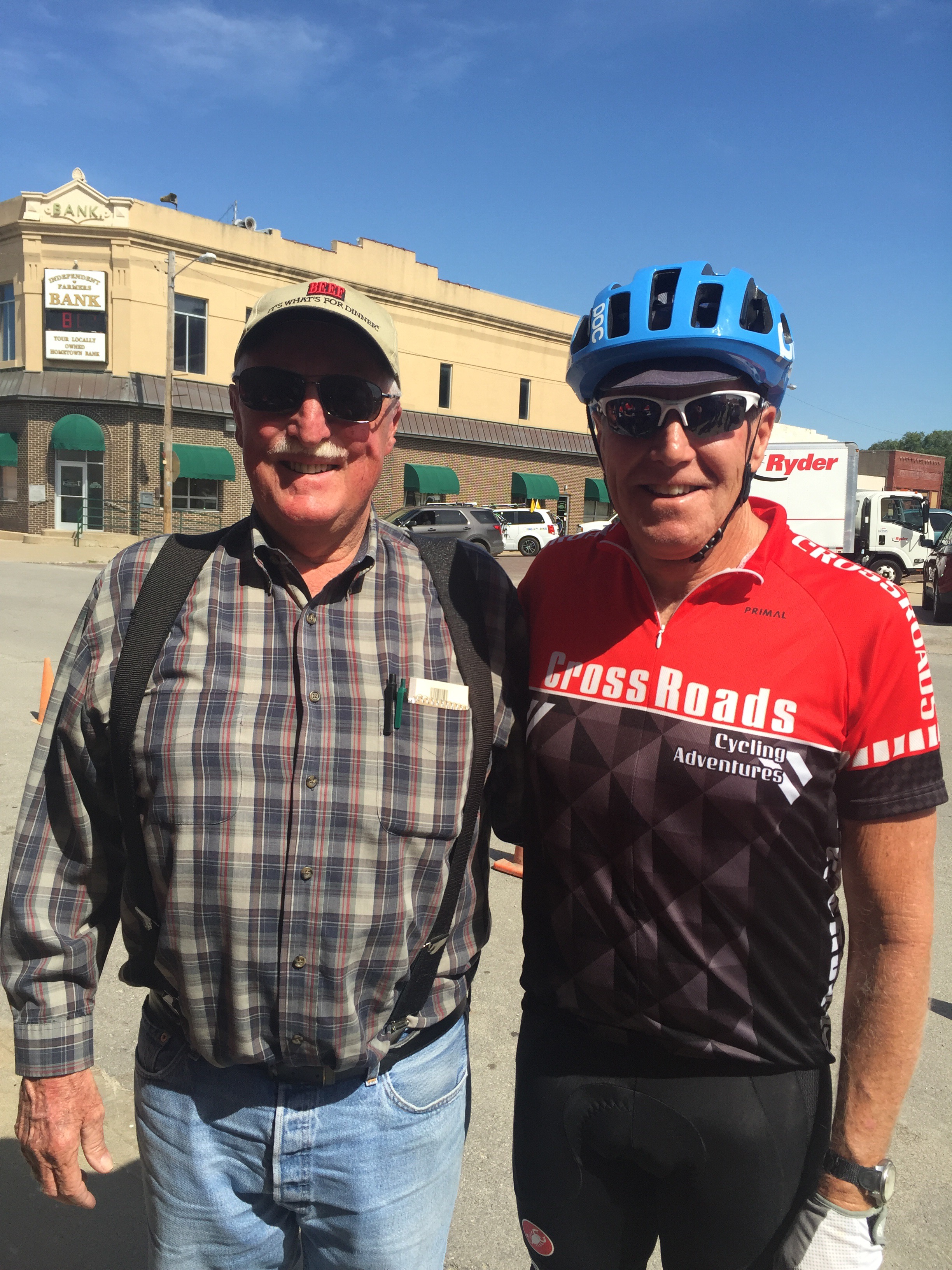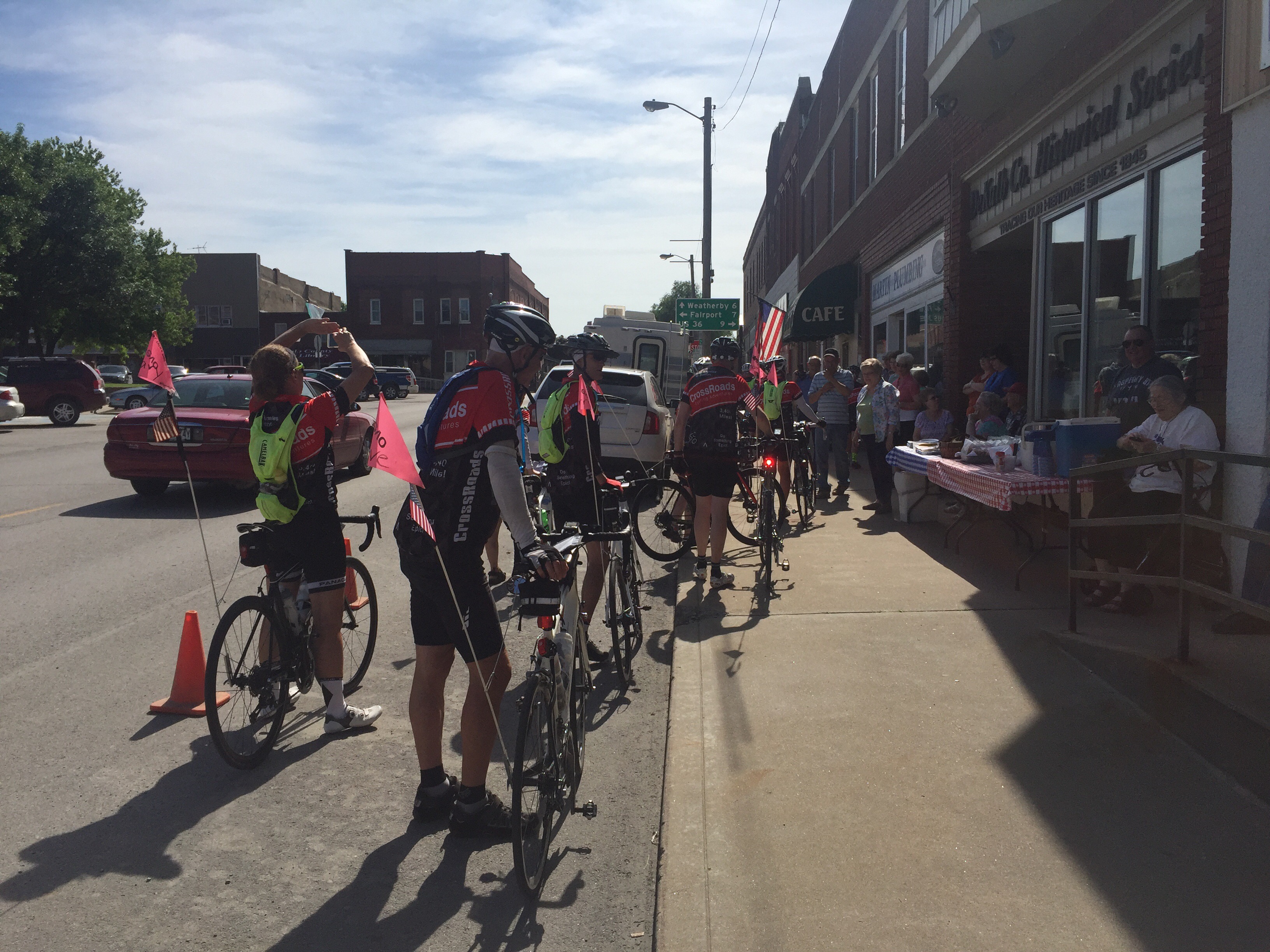 Today we were greated by the locals at a very small town of 1200 called Mayville. Every year they gather to great, cheer and meet the Crossroads riders. They make quite the big deal about it. In fact apparently they plan it all year long, it’s even discussed at town council meetings. They love the owner Tracey of Crossroads as she’s come thru for 22 years with her riders. One guy, Buck gets up at 4 am and bakes his scrumptious cinnamon rolls. We were treated like celebrities. The mayor was there, the newspaper and they open up the historical society museum for us to tour Etc. It was classic, everyone was so amazing and genuine. One cattle rancher I talked to was a former Mo. state senetor. After being told by the mayor that Mayville has 1200 residents, another woman corrected him. It seems it’s now actually 1182. She says the town is getting smaller with folks kicking the bucket ! See photos